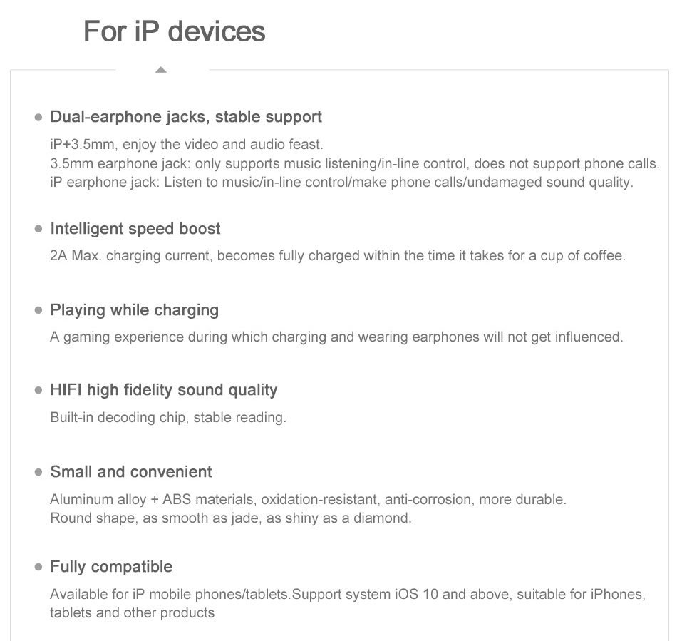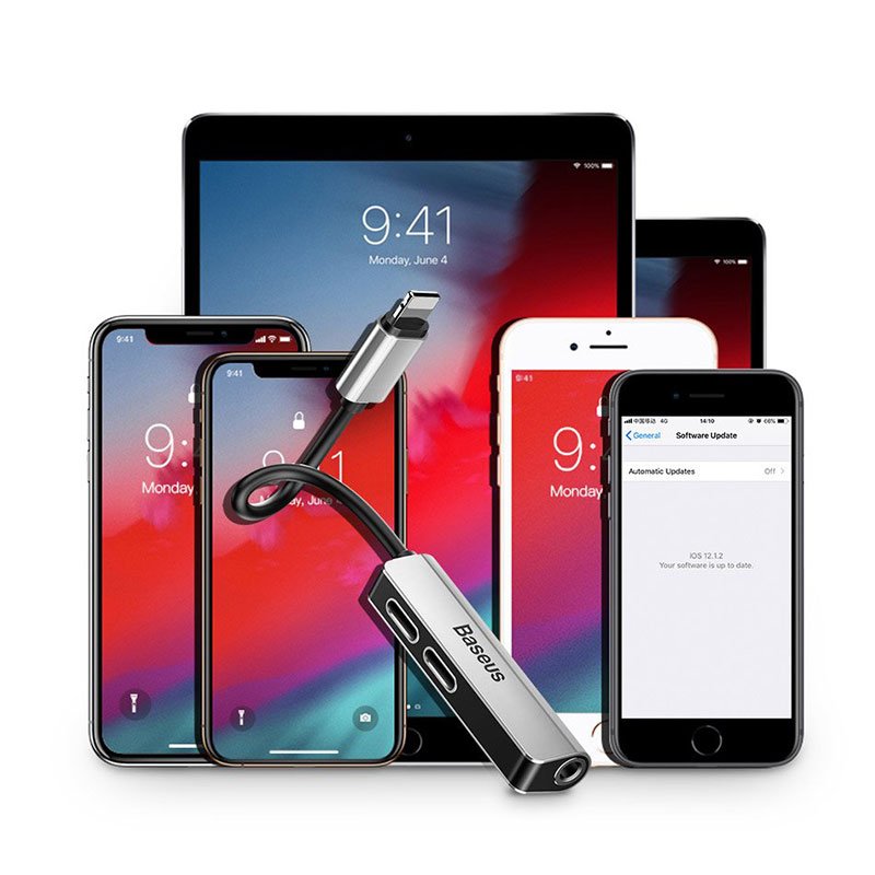 - Lightning to Lightning-audio, Lightning-charging and 3.5mm jack aux audio