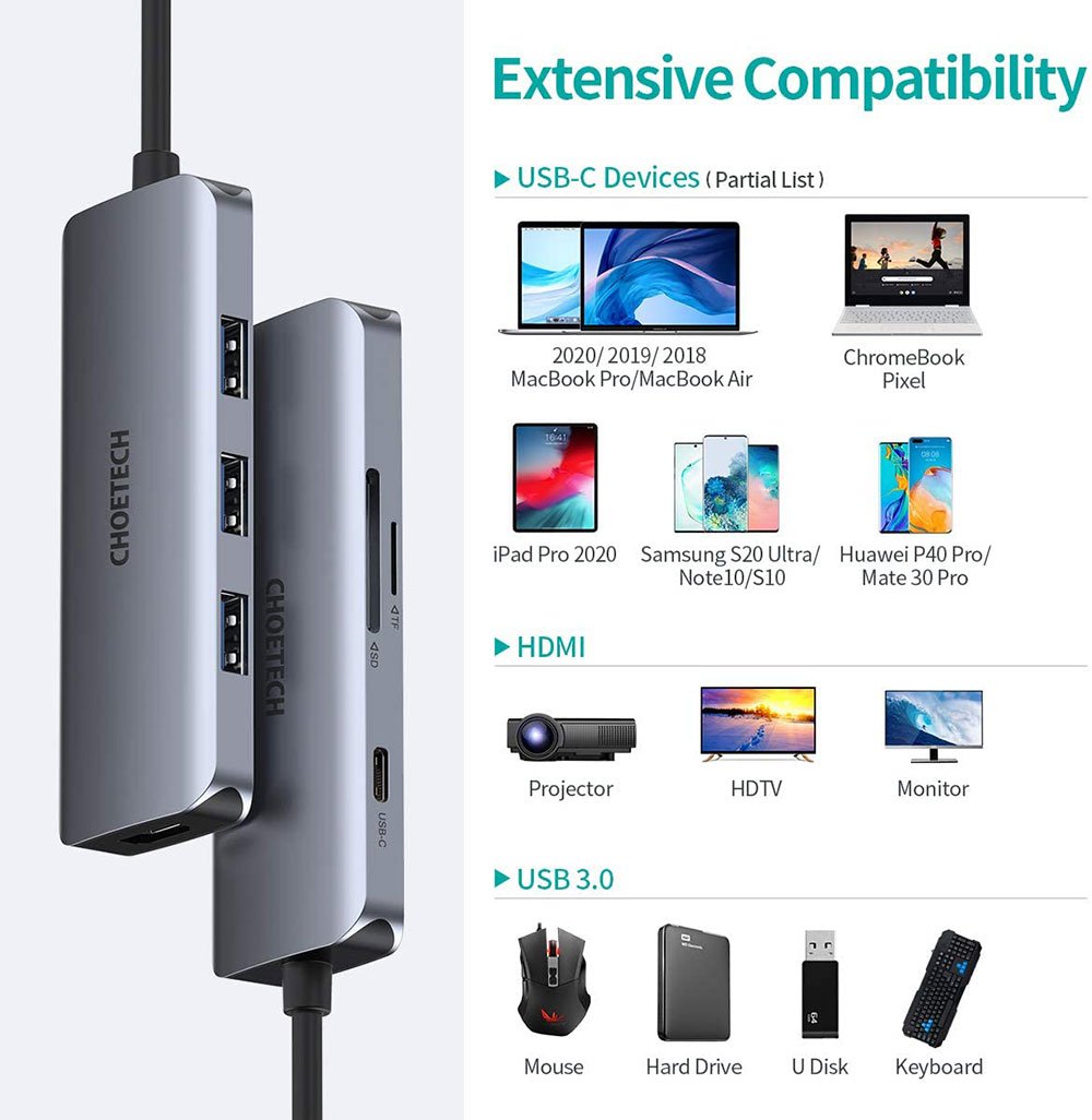 - 4K@30Hz UHD Resolution: CHOETECH type c usb hub allows you to mirror your USB-C laptops display to your HDMI enabled TV or display with up to 3840*2160@30Hz resolution, bringing you stable and clear visual effect. Backward compatible with 1080p, 720p.