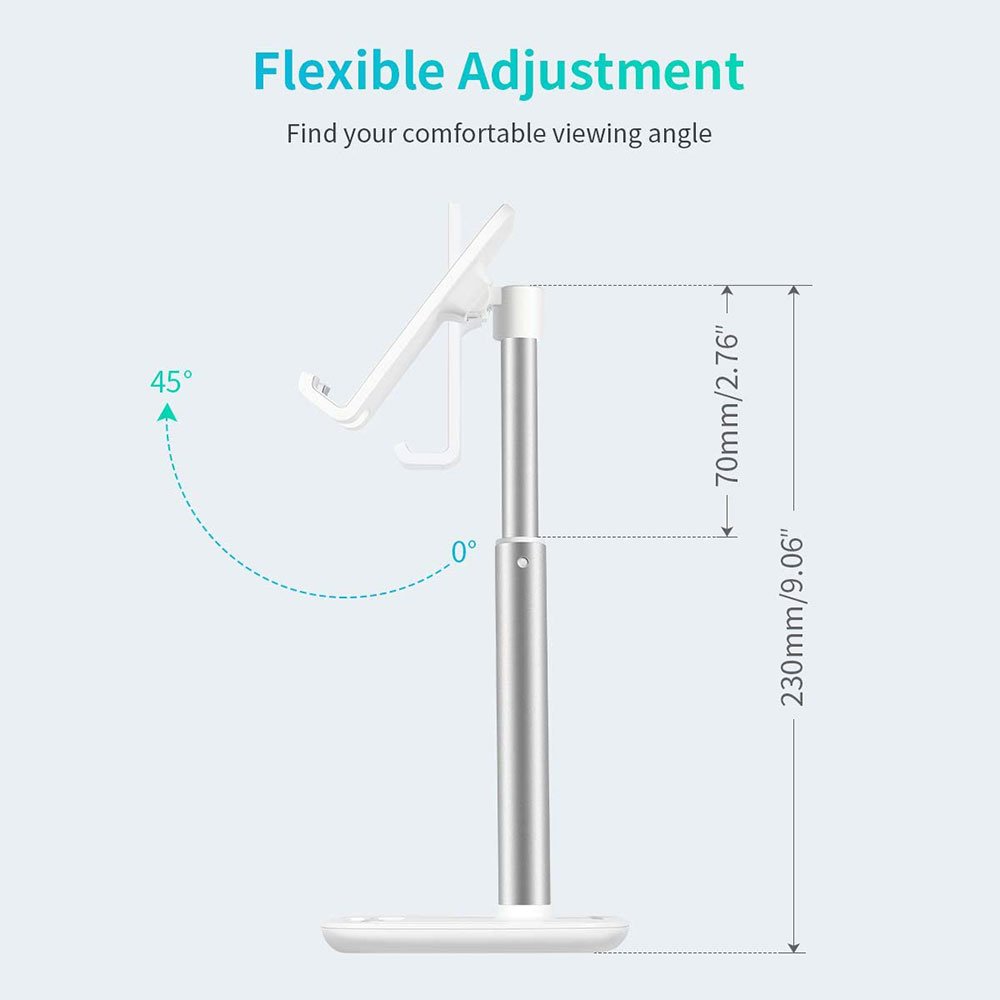 - Height & Angle Adjustable: The phone stand follows strictly ergonomic design. 7cm max height and 45 degrees max angle adjustable provide a comfortable viewing angle for you, which helps you take right posture to enjoy live shows, films, video meeting, online teaching, etc. (Tips: In order to secure this stand support column heavier tablet or some of the equipment, when necessary extends tugged, extending tightness in order to better hold live equipment. )