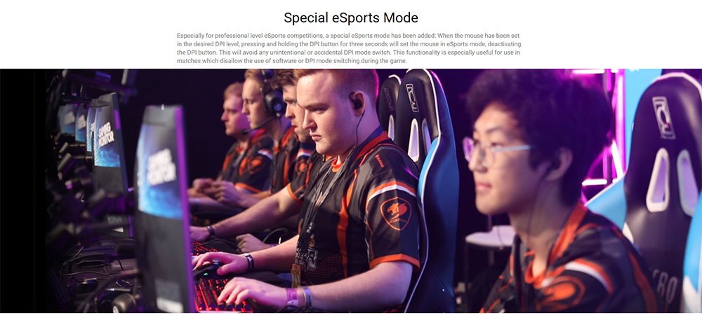 - Special eSports Mode: Especially for professional level eSports competitions, a special eSports mode has been added: When the mouse has been set in the desired DPI level, pressing and holding the DPI button for three seconds will set the mouse in eSports mode, deactivating the DPI button. This will avoid any unintentional or accidental DPI mode switch. This functionality is especially useful for use in matches which disallow the use of software or DPI mode switching during the game.