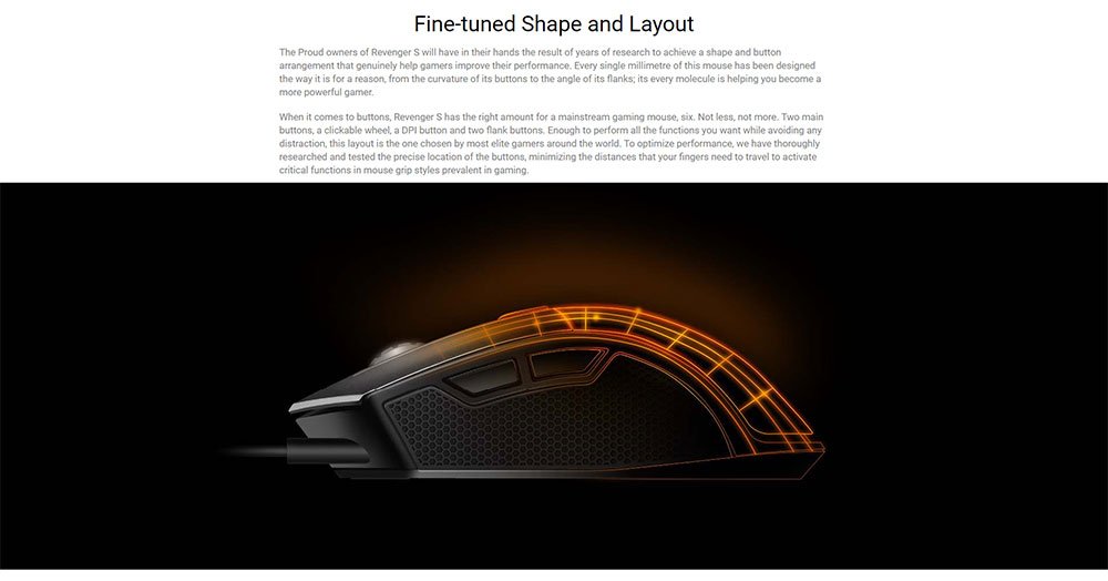 - Fine-tuned Shape and Layout: The Proud owners of Revenger S will have in their hands the result of years of research to achieve a shape and button arrangement that genuinely help gamers improve their performance. Every single millimeter of this mouse has been designed the way it is for a reason, from the curvature of its buttons to the angle of its flanks; its every molecule is helping you become a more powerful gamer. When it comes to buttons, Revenger S has the right amount for a mainstream gaming mouse, six. Not less, not more. Two main buttons, a clickable wheel, a DPI button and two flank buttons. Enough to perform all the functions you want while avoiding any distraction, this layout is the one chosen by most elite gamers around the world. To optimize performance, we have thoroughly researched and tested the precise location of the buttons, minimizing the distances that your fingers need to travel to activate critical functions in mouse grip styles prevalent in gaming.