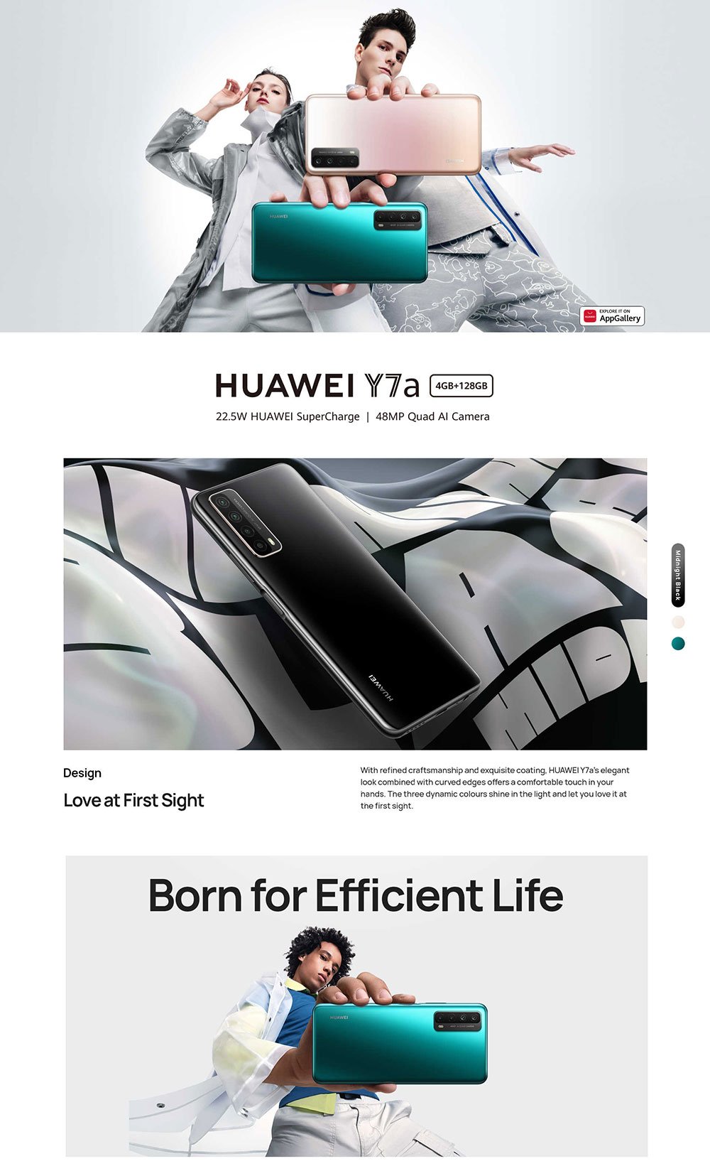 - Design Love at First Sight: With refined craftsmanship and exquisite coating, HUAWEI Y7a’s elegant look combined with curved edges offers a comfortable touch in your hands. The three dynamic colours shine in the light and let you love it at the first sight.