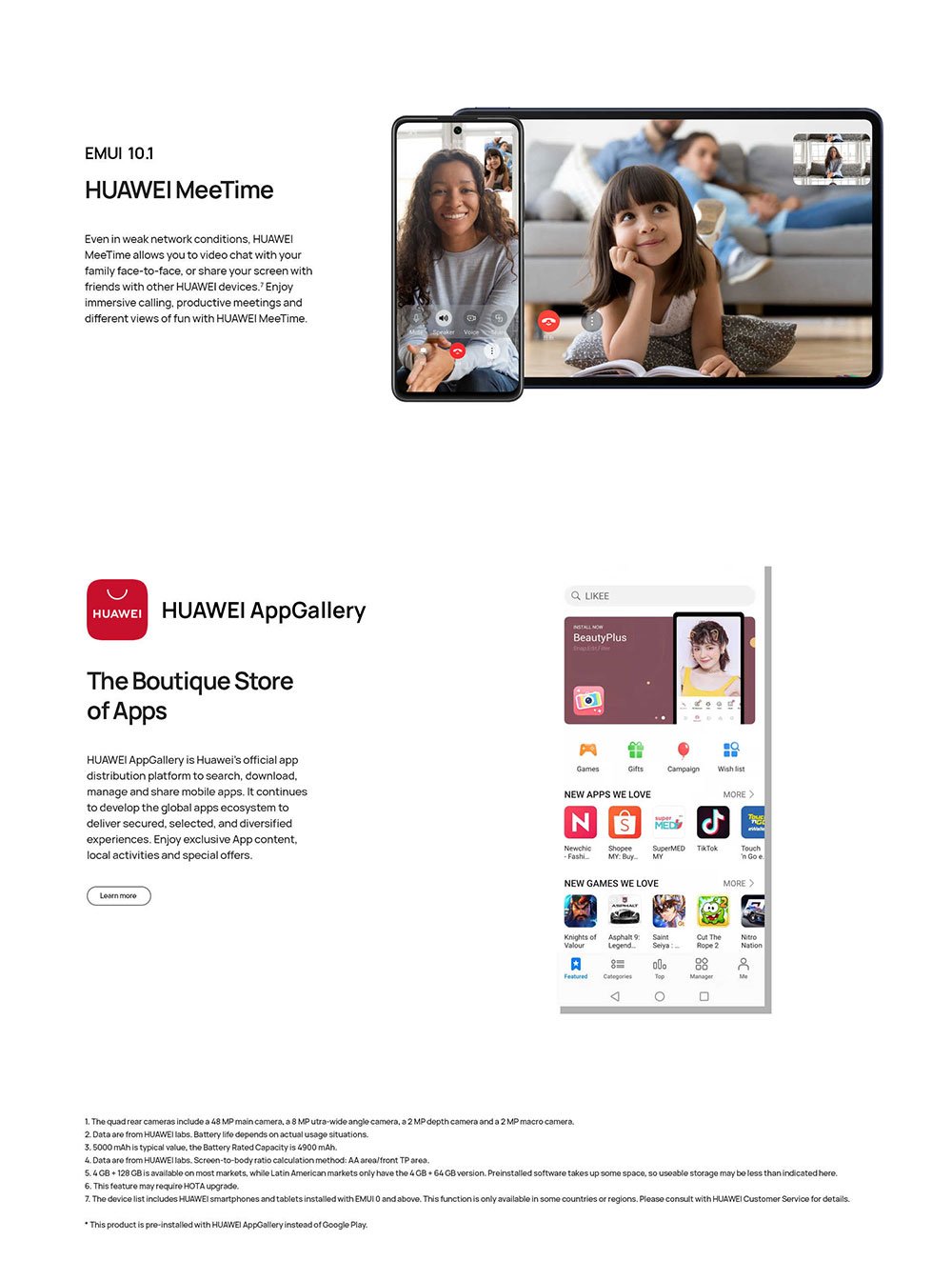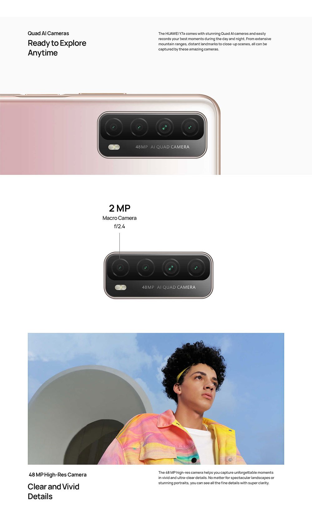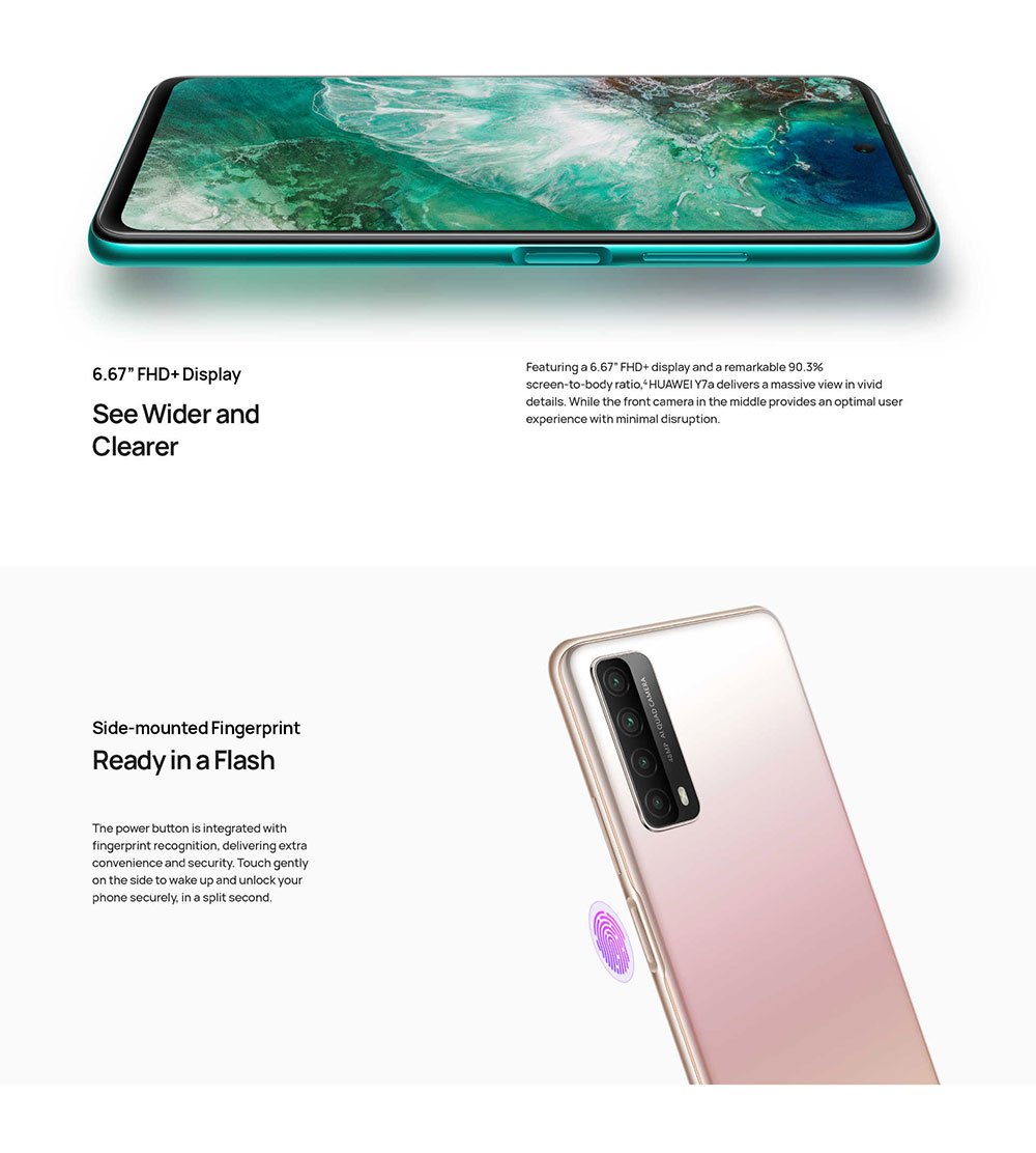 - 6.67″ FHD+ Display See Wider and Clearer: Featuring a 6.67″ FHD+ display and a remarkable 90.3% screen-to-body ratio,4 HUAWEI Y7a delivers a massive view in vivid details. While the front camera in the middle provides an optimal user experience with minimal disruption.