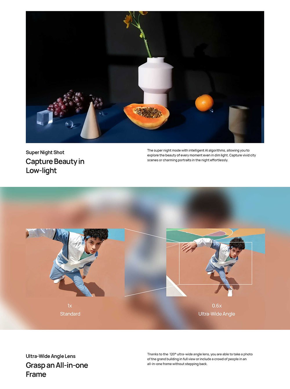 - Super Night Shot Capture Beauty in Low-light: The super night mode with intelligent AI algorithms, allowing you to explore the beauty of every moment even in dim light. Capture vivid city scenes or charming portraits in the night effortlessly.