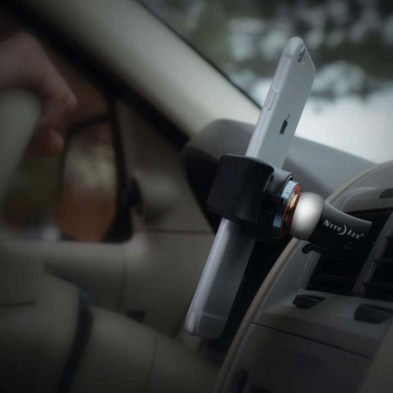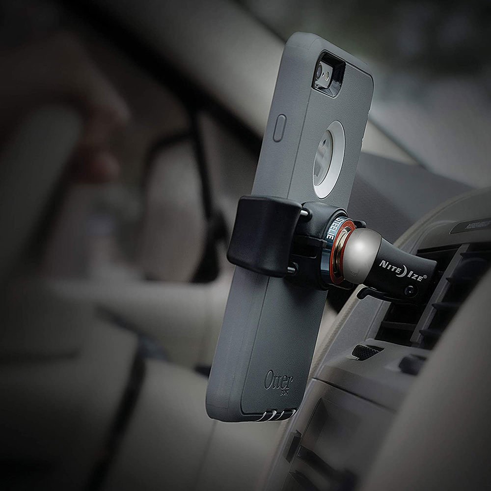 Enjoy safe, hands-free use of your phone when you’re on the go with the Steelie FreeMount Vent Kit from Nite Ize. This universal kit works with most types of vehicle vents and smartphones. Phones stay gripped securely in the adjustable FreeMount, which then connects magnetically to the Vent Mount. The FreeMount arms can be adjusted to hold phones in place, and the release button on the back makes it easy to remove your phone in a single, smooth motion. The Vent Mount is a portable solution that can be moved easily from car to car by simply unsnapping the cam locking lever, then clicking it back in place on the next vehicle vent. The round shape of the ball on the Vent Mount allows the FreeMount to smoothly articulate for the desired viewing angle. As an added bonus, when the FreeMount is on your phone, it allows it to connect magnetically to other convenient surfaces like your refrigerator or tool box.