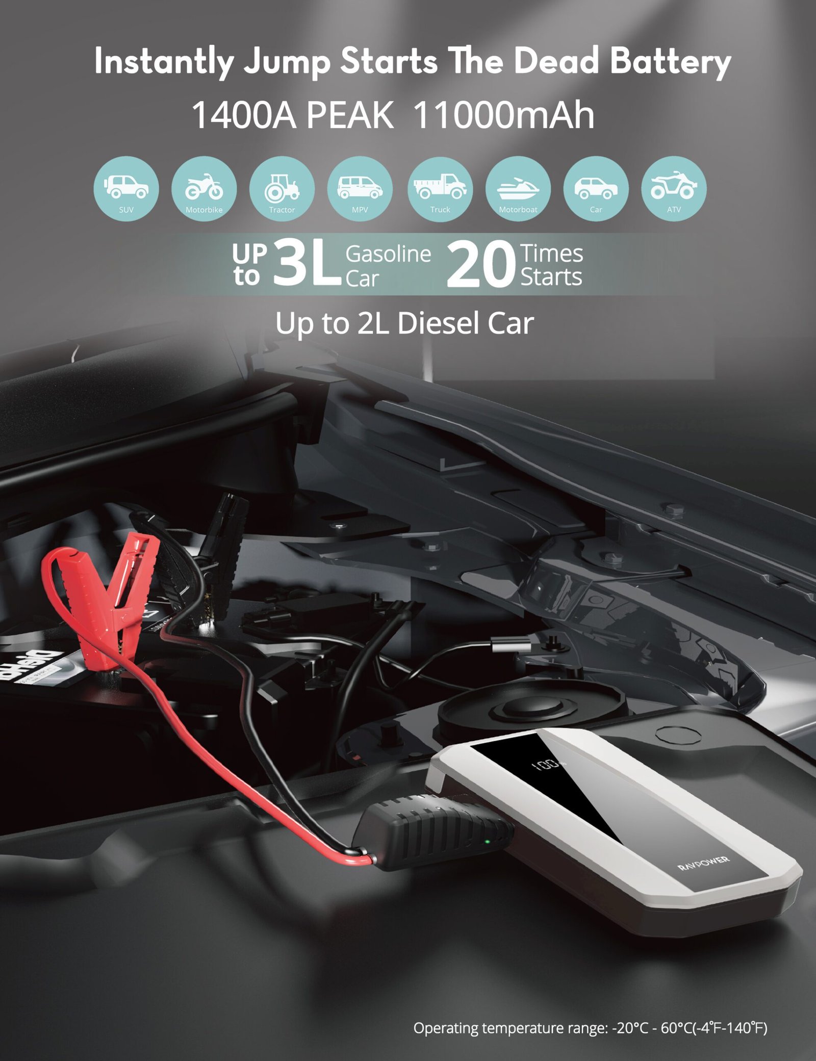 – Instantly jump starts the dead battery: SUV, motorbike, tractor MPV, truck, motorboat, car and ATV