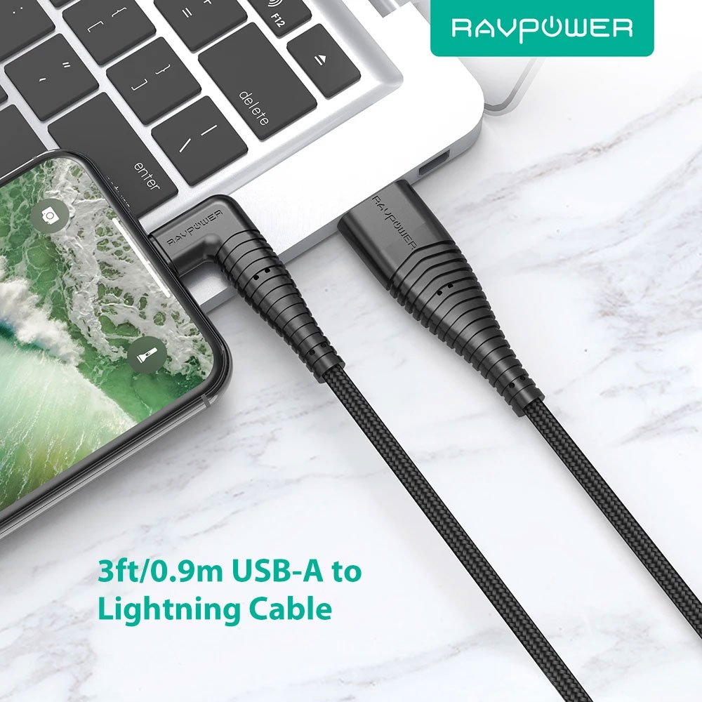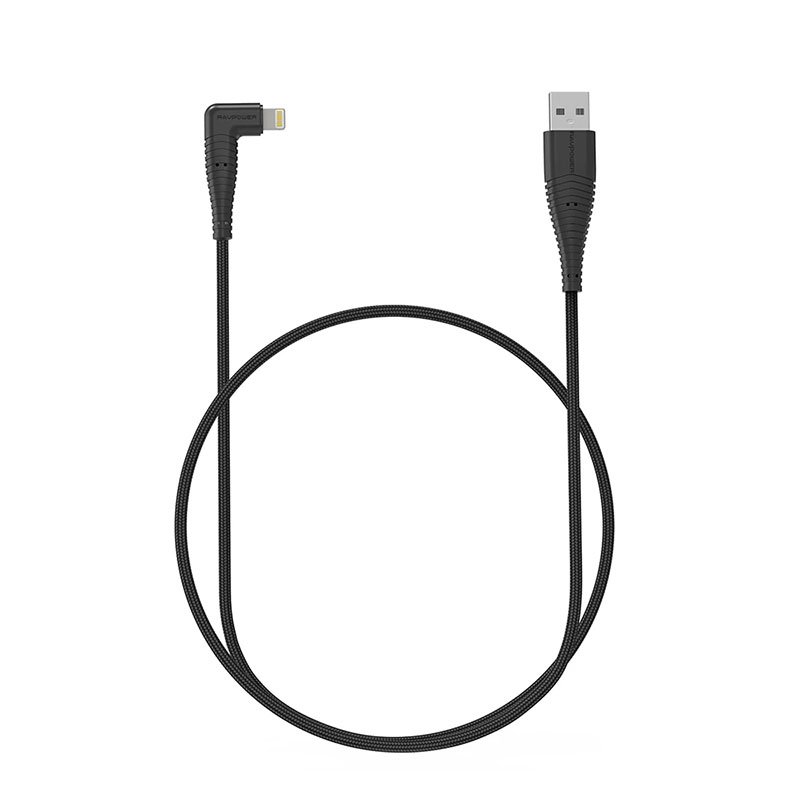 RAVPower Nylon Braided 90deg USB Cable with Lightning Connector, USB-A to Lightning, Nylon Braided Lightning Cable RP-CB013 (0.9m/3ft) – Black