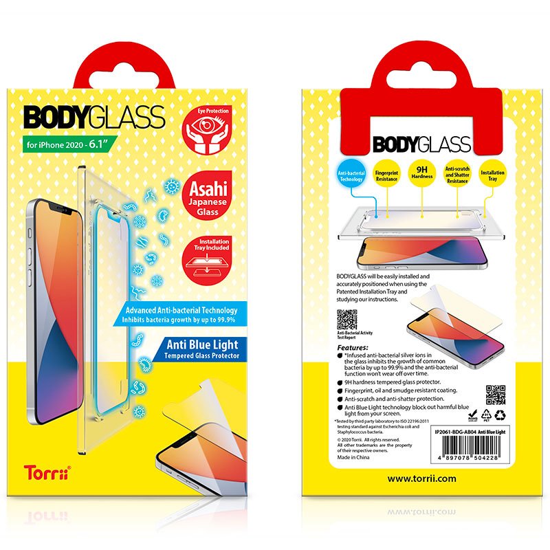 Torrii BodyGlass Screen Protector for iPhone 12/iPhone 12 Pro (6.1″) with Anti-Bacterial Coating, 9H Hardness Japanese Tempered Glass Protector, Anti Blue Light